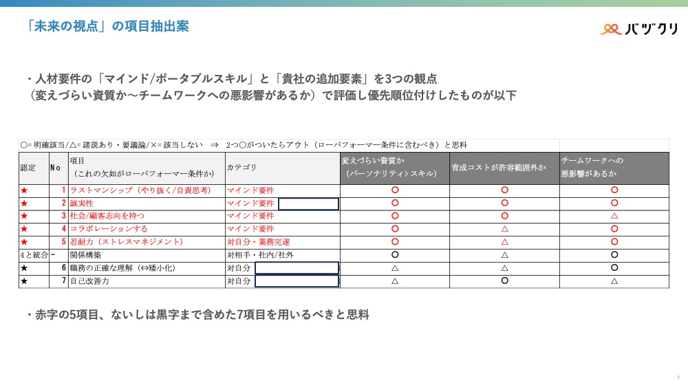 「未来の視点」における改善可能性の評価には、以下の7項目を活用します。「変えづらい資質か」「育成コストが許容範囲外か」「チームワークへの悪影響があるか」の3観点で各項目を評価し、2つ以上の○がついた場合をローパフォーマー条件に含むべきとしました。