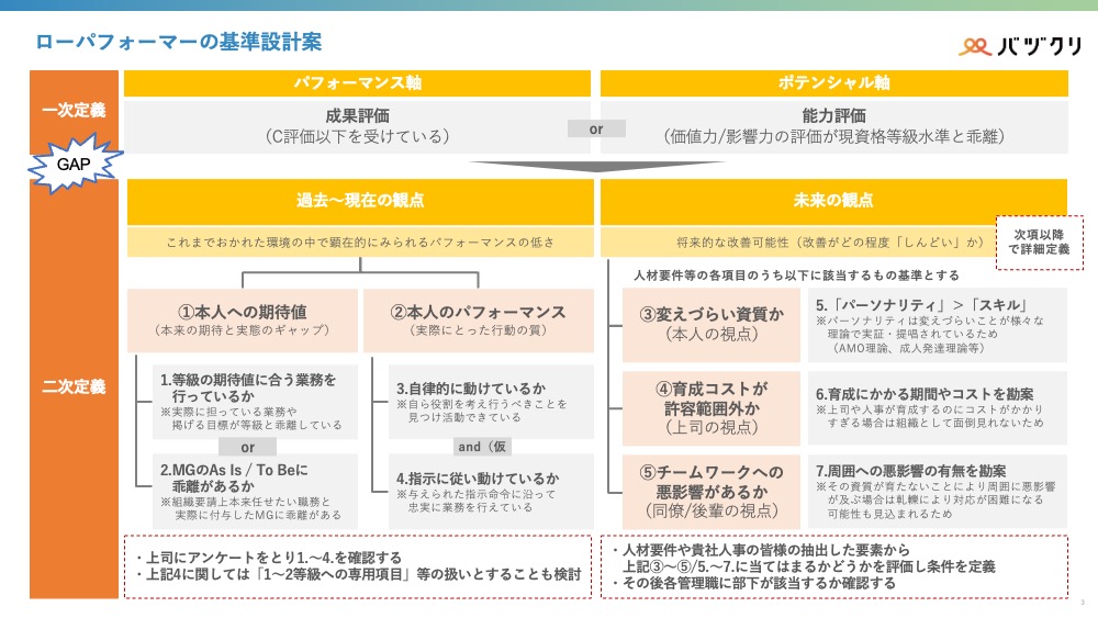 「ローパフォーマー」の定義があいまいなまま対応を始めると、必ず管理職や人事の間で判断がばらつきます。そこでまず、以下の2軸で「一次定義」を設計しました。